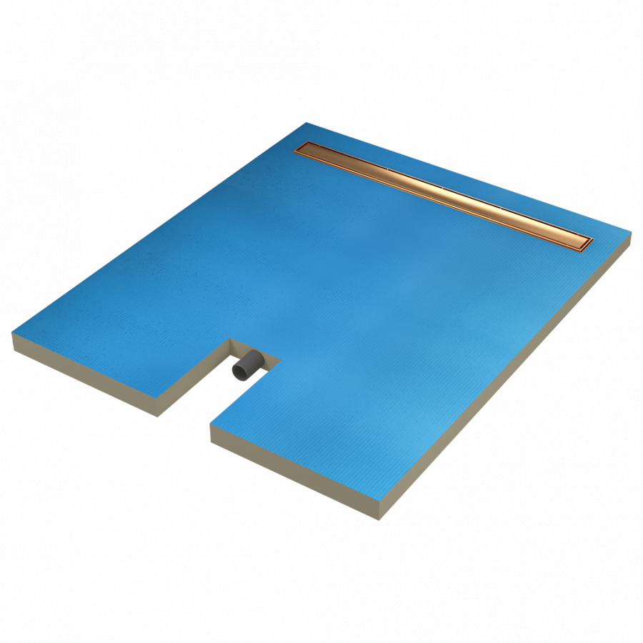 Burkolható szigetelt zuhanytálca akadálymentes, teljes egészében nemesacél vonalmenti összefolyóval, egyoldali lejtéssel, beépített szifonnal.