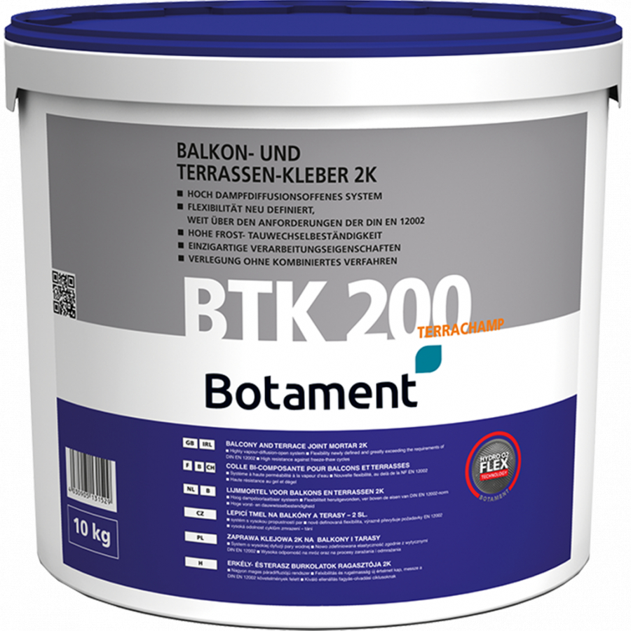 A következő burkolatok ragasztásához: fagyálló mázas és kőporcelán (gres) lapok, húzott fagyálló lapok, klinker burkolólapok, kézzel formázott fagyálló kerámiák, kis és közepes kerámia mozaik, sokféle természetes kőburkolat. Beépítése kizárólag a BOTAMENT® TERRACHAMP rendszerben, a BOTAMENT® BTF 200 TERRACHAMP Erkély- és terasz, vagy Botament Diamond multifunkcionális fugázóval együtt lehetséges.